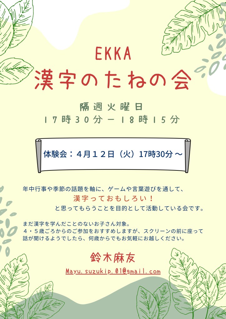 お知らせ, クラス内容漢字のたねの会 09/04/2022 Eiko 2月から始まったまゆ先生の漢字のたねの会、新しくまた4月末から始まります!!! ご興味ある方は4月12日が無料体験会なので奮ってご参加ください😊 共有: クリックして X で共有 (新しいウィンドウで開きます) X Facebook で共有するにはクリックしてください (新しいウィンドウで開きます) Facebook いいね 読み込み中… 関連