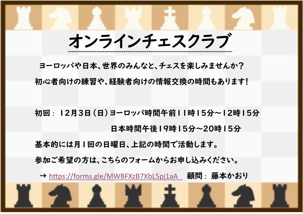 お知らせ新・チェス部始動! 29/11/2023 Eiko 新しく、チェス部の活動が始まります♟️初回は12月3日(日)、CET午前11時15分~12時15分/JST午後19時15分~20時15分です。 チェスをよく知らなくても、すでにたくさん遊んでいてもOKだそうです。今後も月1回で活動していく予定だそうですので、興味のある方はぜひ一度遊びに来てください! 登録フォームはこちら 共有: クリックして X で共有 (新しいウィンドウで開きます) X Facebook で共有するにはクリックしてください (新しいウィンドウで開きます) Facebook いいね 読み込み中… 関連
