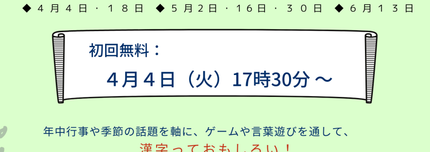 今期も始まります! 10月3日(火)17:30〜は無料体験になりますので、ご興味ある方はぜひ😉 もしかすると月… 続きを読む 漢字のたねの会