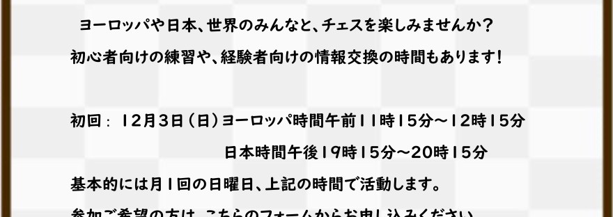 新しく、チェス部の活動が始まります♟️初回は12月3日(日)、CET午前11時15分~12時15分/JST午後… 続きを読む 新・チェス部始動!